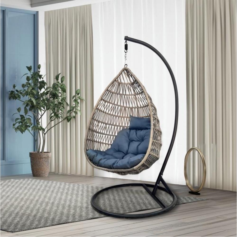 Размер корзины: WH131хW91хD68 см Стойка: H2,0xD1,0 м, Каркас сталь. Материал плетения на корзине: искусственный ротанг серого цвета. Подушка однотонная синяя. Ткань с водоотталкивающей пропиткой. Допустимая нагрузка: 120 кг.