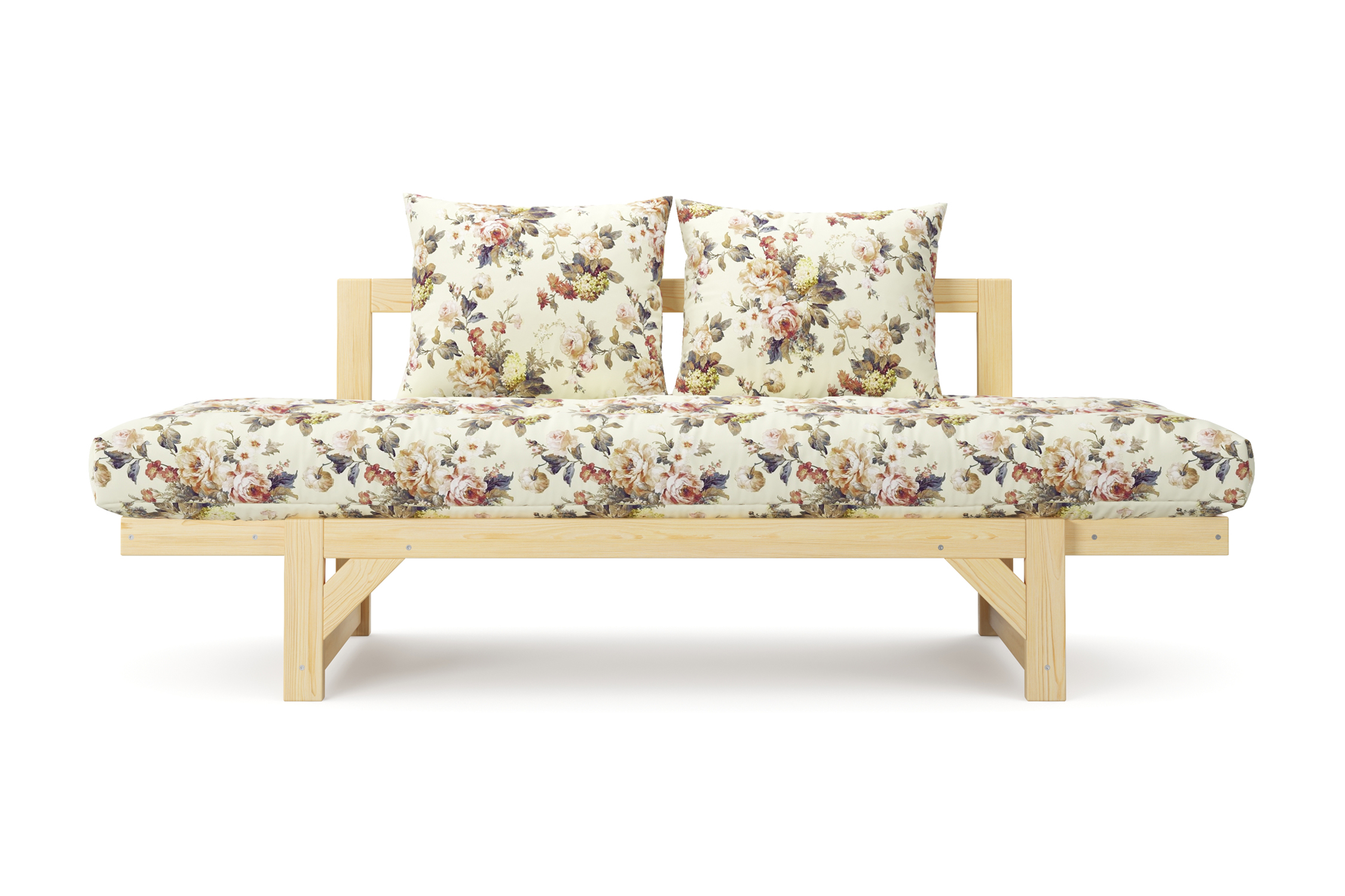 Максимальная нагрузка — 220кг. Ширина деревянной спинки 130 см. Приспинные подушки, представленные на фото, входят в комплект. Декоративные приобретаются отдельно. Диван продается без лакокрасочного покрытия, под самостоятельную покраску. Высота сиденья без матраса - 31 см, с матрасом 46 см.